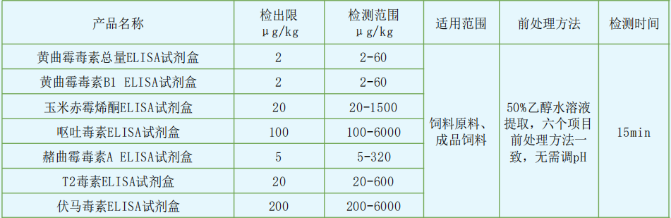 1)六项毒素产品,样品前处理方法统一,均采用50%的乙醇提取,无毒无害;